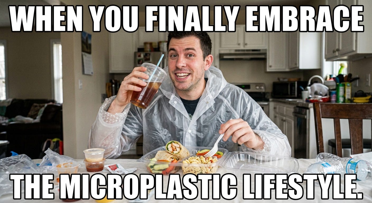 This is what the modern human looks like. We eat plastic, drink plastic, breathe plastic, and now wear plastic too!