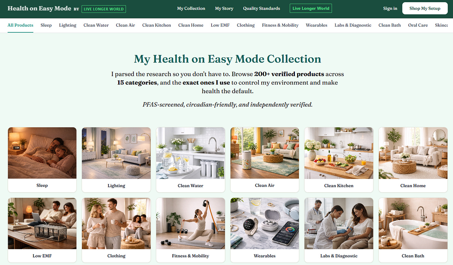 I built Health on Easy Mode as my curated collection of low‑toxin, PFAS‑screened, lower‑plastic products I actually use at home (light, air, water, kitchen, diagnostics, etc.). Inclusion is 100% merit‑based. Brands don’t pay to place.
