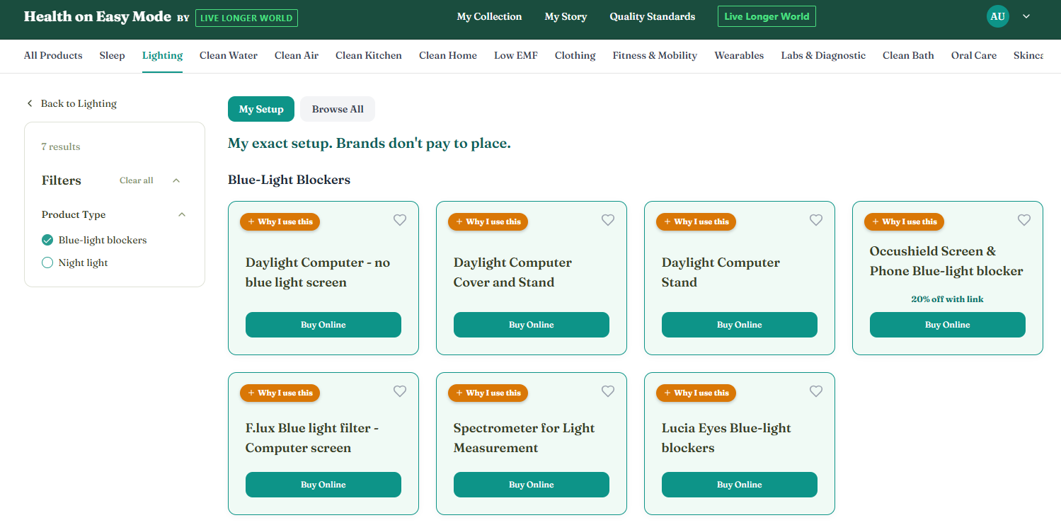 Browse my Health on Easy Mode setup across 15+ categories (non-toxic kitchen, clean water, skincare, diagnostics, lighting).