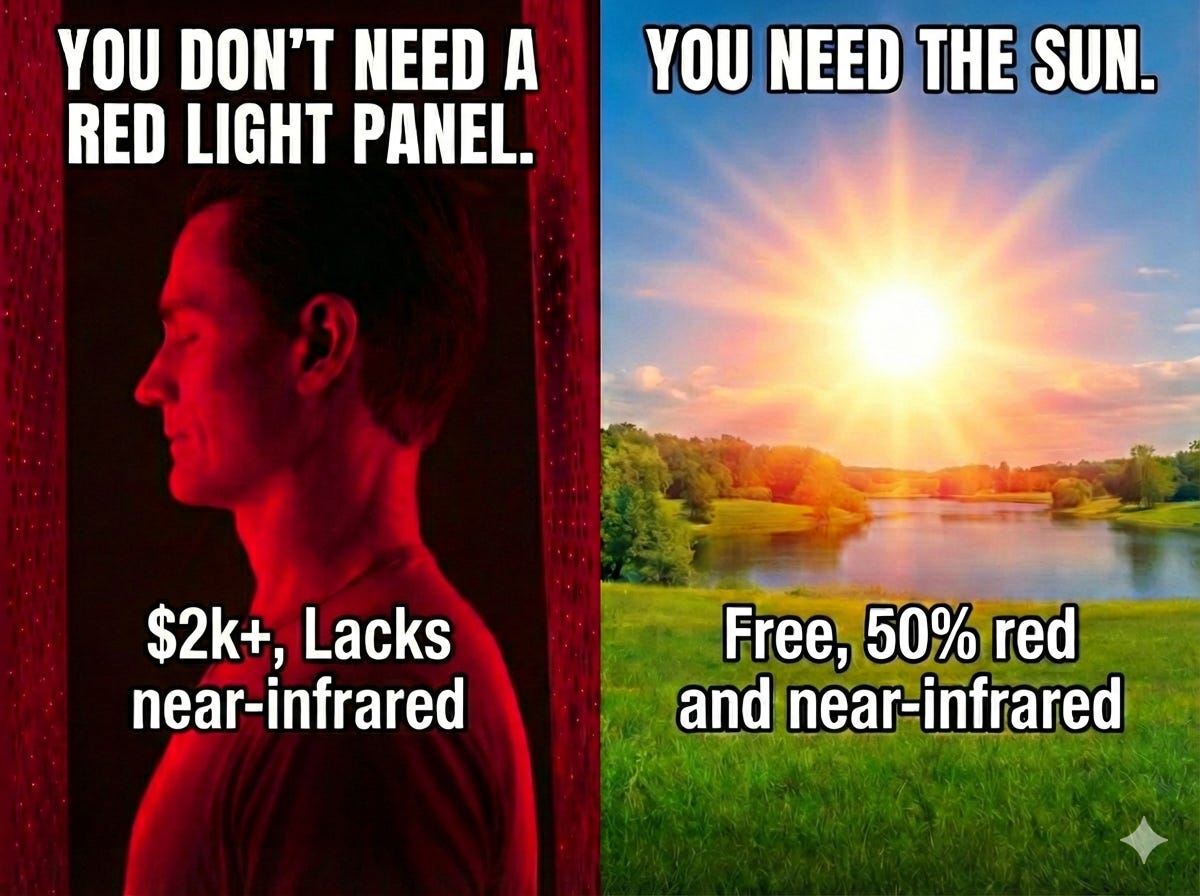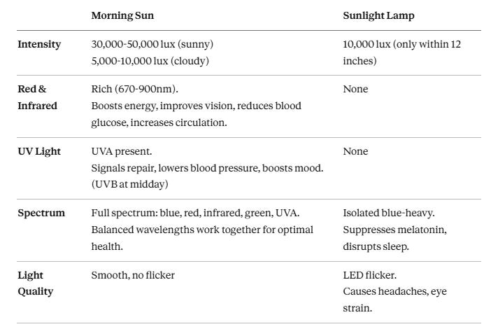 But intensity is just one piece. Health influencers miss the other irreplaceable benefits conferred by morning sunlight. Morning sunlight is irreplaceable in its unique benefits. No sunlamp or LED/artificial light comes close.